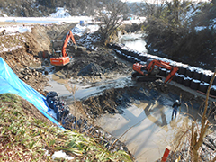 | 工事担当者より一言 | 施工延長約40mの短い延長の中に河川土工、仮締切工、床固工、垂直壁工、側壁工、等々10種類以上に及ぶ工種がある河川工事でした。 工種の多さもさることながら、河川工事という性質上、出水期(6月下旬以降)の作業は出来ません。それまでに何としても河川に影響のない高さまで上がってしわわなければなりませんでした。 限られた時間の中、狭い範囲で安全に同時進行可能な限りの複数工種を施工し、工程の短縮を行いました。 他にも仮締切りの撤去方法等、とても頭を抱える場面がいくつもありましたが、協力会社、弊社スタッフのおかげで出水の影響もなく、完成することが出来ました。 |